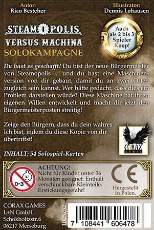 Die Steamopolis - Versus Machina - Kampagnen-Erweiterung kann solo oder als kooperatives Spiel gespielt werden. Es handelt sich um ein Kampagnenspiel, dessen Geschichte sich über mehrere Partien hinweg entwickelt und das viele Stunden Spielspaß bietet.