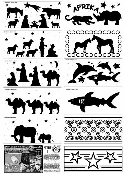 5 DIN A3 Seiten, mit 11 Motiven für das famose Dosenlichter-Klopfgerät. (Ideal für Schulklassen oder Kindergarten). 11 Motive, jedes Motiv ist 5 mal verfügbar. (=55 Vorlagen)