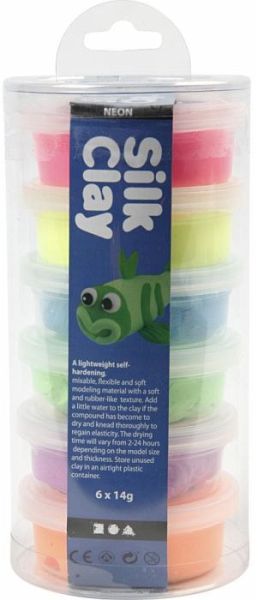 geschmeidig, leichte Modelliermasse - bleibt nach dem Trocknen weich und gummiartig. Inhalt: 6 Dosen je 14g (neon gelb, neon orange, neon pink, neon lila, neon grün, neon blau. Ab 3 Jahren.