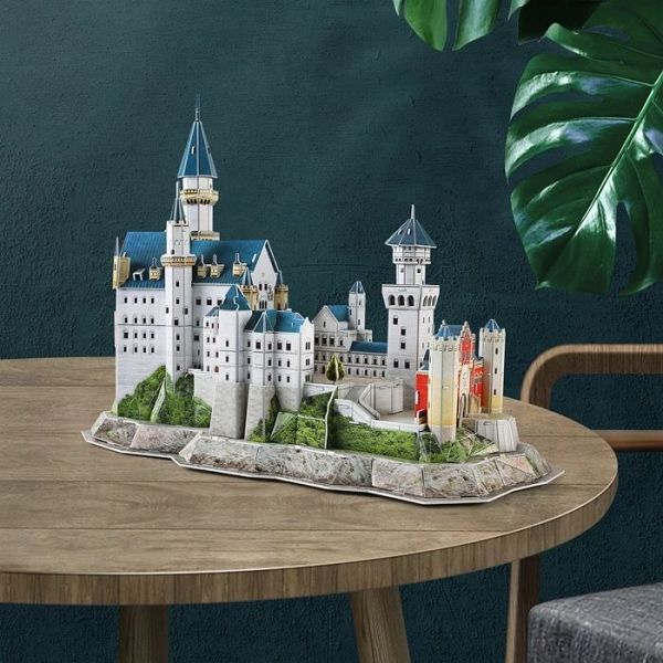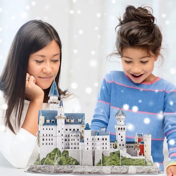 Mit diesem 3D Puzzle von CubicFun kann ohne Leim und Schere das beliebte Wahrzeichen Schloss Neuschwanstein als 3D Modell nachgebaut werden. Die bebilderte Anleitung führt Schritt für Schritt zum fertigen 3D Puzzle. Die hochwertigen Teile lassen auch mehrfaches Aufbauen zu. Zusammen mit dem beliegenden Heft von National Geographic wird daraus eine Reise nach durch Deutschland. Höhe: 33 cm.