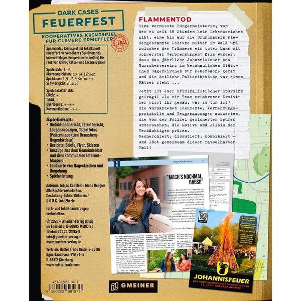 Eine vermisste Bürgermeisterin, von der es seit 48 Stunden kein Lebenszeichen gibt, eine bis auf die Grundmauern niedergebrannte Scheune mitten im Wald und zwischen den Trümmern ein toter Mann mit schwersten Verbrennungen! Kein Wunder, dass das jährliche Johannisfeuer des Burschenvereins im beschaulichen Städtchen Hagenkirchen zur Nebensache gerät und die örtliche Polizeibehörde vor einem Rätsel steht ...Jetzt ist euer kriminalistischer Spürsinn gefragt! Als ein Team erfahrener Ermittler wisst ihr genau, was zu tun ist: die vorhandenen Dokumente, Vernehmungsprotokolle und Zeugenaussagen auswerten, die von der Polizei gesicherten Spuren untersuchen, die Motive und Alibis der Verdächtigen prüfen.Recherchiert, diskutiert, kombiniert - und löst gemeinsam diesen rätselhaften Fall!