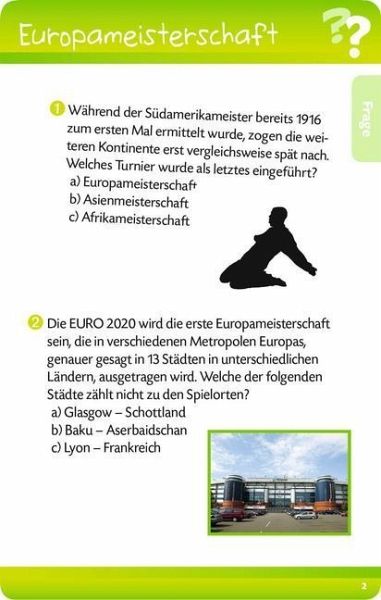 Ein Quiz- und Rätselspaß mit vielen aktuellen Fragen und Bildern, aber auch mit Infos und Fragen zu legendären Spielen, Toren und Stars aus der großen Fußball-Vergangenheit - von Mbappé und Sané bis zu Beckenbauer und Pelé!