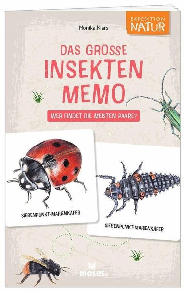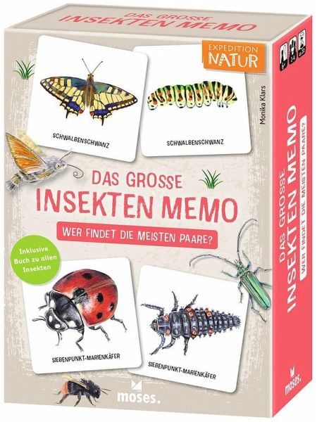 Das besondere Memo-Spiel mit Aha!-Effekt! Wie beim klassischen Memo-Spiel lautet die Aufgabe Paare zu finden. Doch bei diesem Memo gibt es einen Twist. Die Paare werden nicht aus gleichen Motiven gebildet, sondern aus unterschiedlichen Motiven. Gesucht wird die Raupe zum jeweiligen Schmetterling, die passende Larve zum Käfer und das richtige Nest zu Bienen, Hummeln und Co. Wer die meisten Paare sammelt, gewinnt.Zur leichteren Zuordnung sind die Kärtchen beschriftet. Außerdem stellt das beiliegende Buch die 30 Insekten vor und zeigt, welche Paare zusammengehören.