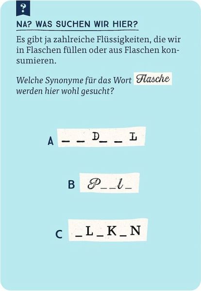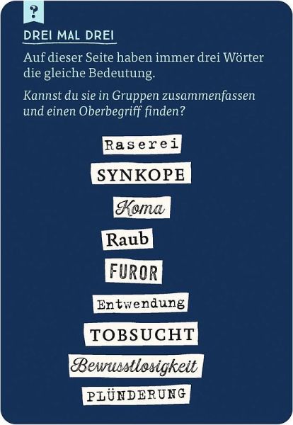 Das Quiz besteht aus 75 Karten, die in einer hochwertigen Schuberbox mit Spotlackveredelung aufbewahrt werden. Jede Karte enthält spannende Fragen zu Synonymen und fordert die Spieler dazu heraus, passende Wörter zu finden oder über deren Bedeutung nachzudenken.