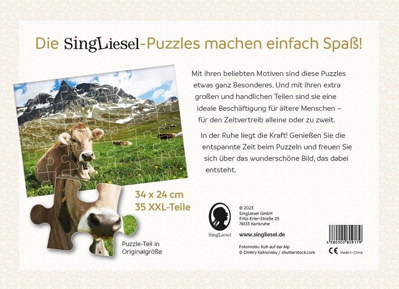 Die schönsten Puzzles mit 35 Teilen im XXL-Format für Menschen mit Demenz und Gedächtnisschwäche.Mit ihren beliebten und farbenfrohen Motiven sind die SingLiesel-Puzzles etwas ganz Besonderes und das perfekte Geschenk für Menschen mit Demenz, Alzheimer oder Gedächtnisschwäche. Die Motive laden zum Entdecken und Erzählen ein und die extra großen und handlichen Teilen lassen sich gut greifen, auch wenn die Finger nicht mehr so gelenkig sind.Die SingLiesel-Puzzles sind deshalb die ideale Beschäftigung für ältere Menschen - für den Zeitvertreib alleine oder zu zweit.