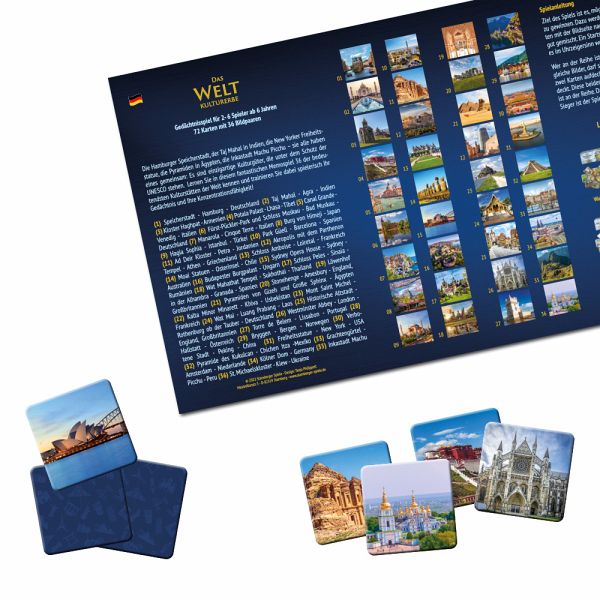 Die Hamburger Speicherstadt, der Taj Mahal in Indien, die New Yorker Freiheitsstaue, die Pyramiden in Ägypten, die Inkastadt Machu Picchu - sie alle haben eines gemeinsam: Es sind einzigartige Kulturgüter, die unter dem Schutz der UNESCO stehen. Lernen Sie in diesem fantastischen Memospiel 36 der bedeutendsten Kulturstätten der Welt kennen und trainieren Sie dabei gleichzeitig spielerisch Ihr Gedächtnis und Ihre Konzentrationsfähigkeit!Für 2-6 Spieler ab 6 Jahren Stabile Spielkarten im Format 6 x 6 cm Maße des Stülpkartons: 23 x 7,5 x 5,5 cm Hochwertige Verarbeitung und Druckqualität Hergestellt in DeutschlandInhalt: 72 Memo-Karten, Spielanleitung mit Detailinformationen zu den Kulturstätten in Deutsch und Englisch