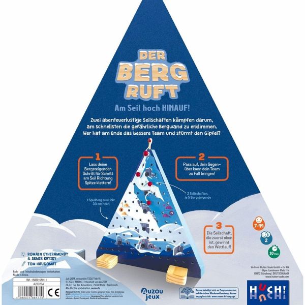 Ihr seid zwei Alpinisten und wetteifert darum, wer mit seinen Bergfreunden zuerst den Gipfel erstürmt. Die Teammitglieder sind jeweils durch ein Seil miteinander verbunden. Bist du an der Reihe, bewegst du ein Mitglied deiner Seilschaft über die Löcher auf deiner Seite nach oben. Die Optionen sind durch die Länge des Seils und der anderen Figuren limitiert. Sucht Schutz hinter Felsen und sorgt dafür, dass ihr auf dem Weg niemanden verliert!