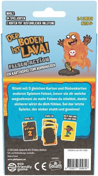 Der Boden ist jetzt Lava - als Kartenspiel. Ziel: Spieler bauen ihre Steinkarten, um sicher zu bleiben, und zerstören die des Gegners. Der letzte, der nicht in der Lava landet, gewinnt. Ein spannendes Kartenspiel, das Strategie und schnelles Handeln erfordert. Wer bleibt trocken, wer versinkt?