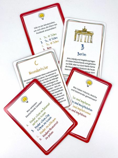 Warum fallen wir nicht von der Erde herunter? Wer darf die Lexikoneinträge bei Wikipedia schreiben? Und wozu brauchen Katzen eigentlich Schnurrhaare?Mithilfe des Bestsellers »Der große Wissenstest für Kinder« konnten die kleinen Weltentdecker ihr Allgemeinwissen bereits unter Beweis stellen.Wer mit seinem Wissen jetzt so richtig punkten will, für den ist dieses Kartenspiel ebenfalls ein Muss. Denn wer die meisten Fragen beantworten kann, gewinnt. So können die Kids nicht nur ihr Wissen mit Gleichaltrigen messen, sondern lernen garantiert auch noch eine Menge Neues und Spannendes dazu.