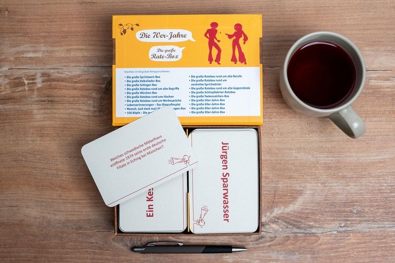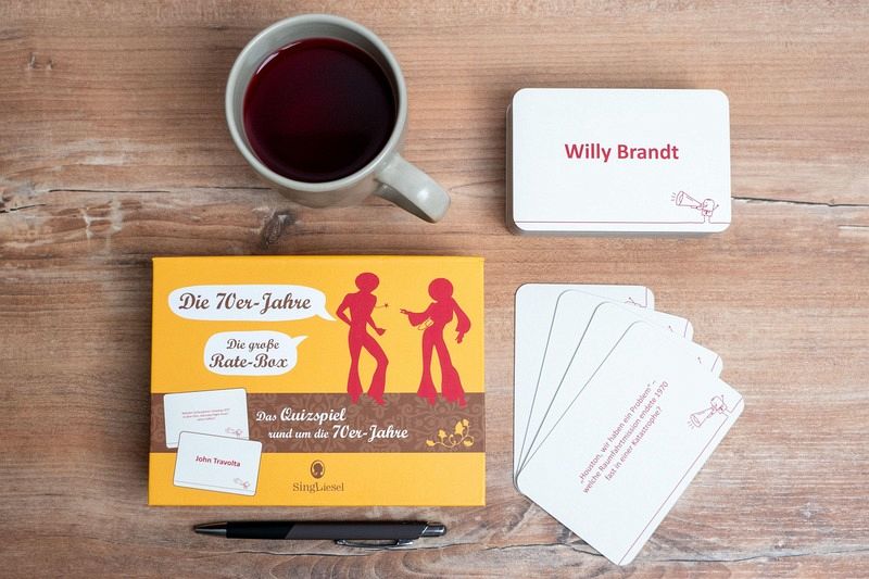 Willkommen in den 70ern!Diese nostalgische Rate-Box lässt mit 100 Quizfragen die 1970er-Jahre wieder aufleben.Hippies, Friedens- und Anti-Atomkraft-Bewegung, aber auch Krisen, Umbrüche und Veränderungen prägen die 1970er-Jahre. Erinnern Sie sich an die Top-Ereignisse der 70er und testen Sie Ihr Wissen: Welche Kindersendung ist soerfolgreich, dass sie seit 1971 jeden Sonntagvormittag ausgestrahlt wird? Gegen welches Bauwerk demonstrierten ab 1976 viele Menschen in Brokdorf vergeblich? Welcher Schauspieler schwang in dem Film "Saturday Night Fever" seine Hüften?Licht aus! Spot an! Mit Fragen zu Politik, Sport, Film, Fernsehen, Musik u.v.m. ist die große 70er-Box ein beliebter Rätselspaß und ein unterhaltsames Gedächtnistraining für Jung und Alt.