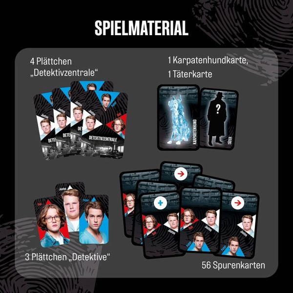 Kinospannung zum Nachspielen! Mit exklusivem Bildmaterial aus dem Film. Ein kniffliger Fall für die drei ??? Für 2-4 Spielerinnen und Spieler ab 8 Jahren. Ein tolles Geschenk zum Kindergeburtstag oder Mitbringsel für Fans. Der Karpatenhund ist verschwunden! Wer hat die wertvolle Skulptur gestohlen? Erwischen Justus, Peter und Bob den Dieb rechtzeitig? Auf die drei ??? warten geheimnisvolle und gefährliche Ermittlungen. Zwei bis vier Spielerinnen und Spieler spielen den Kinofilm "Die drei ??? und der Karpatenhund" noch einmal nach. Karte für Karte sammeln sie Beweise, suchen Verdächtige und ermitteln in alle Richtungen. Ein Fall zum Mitfiebern mit exklusivem Bildmaterial aus dem Film. Großer Spielspaß mit den drei Detektiven und ihrem neuesten Kinoabenteuer - ein Muss für alle Krimi-Fans und Nachwuchsdetektive ab acht Jahren!