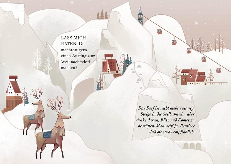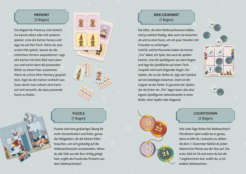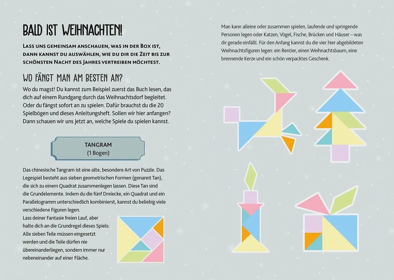 Du kannst Weihnachten kaum erwarten? Du möchtest die Zeit bis zum großen Fest abwechslungsreich verkürzen? Egal, ob du über die Feiertage nach Hause reist oder bereits dort bist, mit dieser magischen Spielbox für unterwegs hast du viele weihnachtliche Aktivitäten immer zur Hand. Entdecke wundervolle Dinge wie 3D-Elfenfiguren, ein adventliches Tangram zum Entschlüsseln, den Weihnachtsmann in seinem Weihnachtsdorf, Dominosteine oder ein Memory-Spiel mit weihnachtlichem Flair. In farbenfrohen, nordisch inspirierten Illustrationen kannst du sofort in die Welt der schönen Vorweihnachtszeit eintauchen.