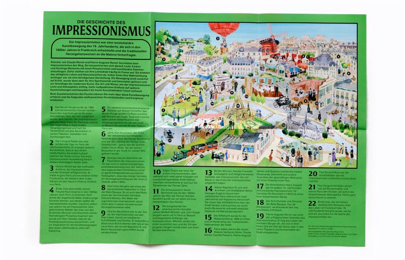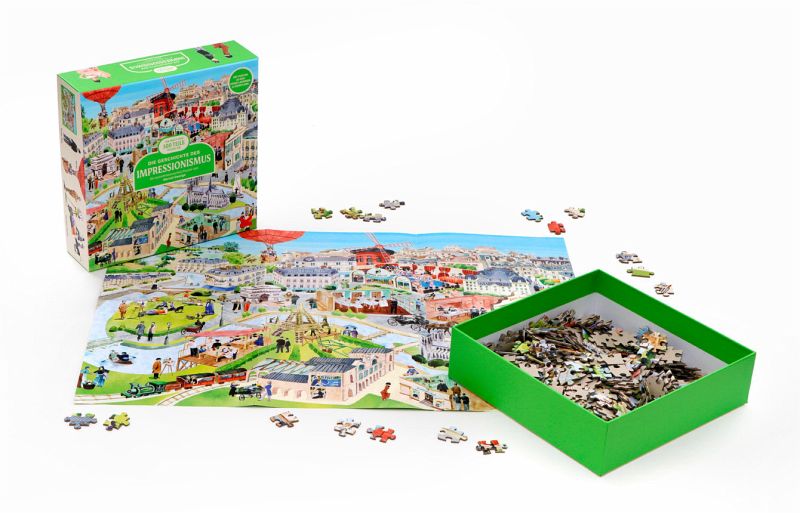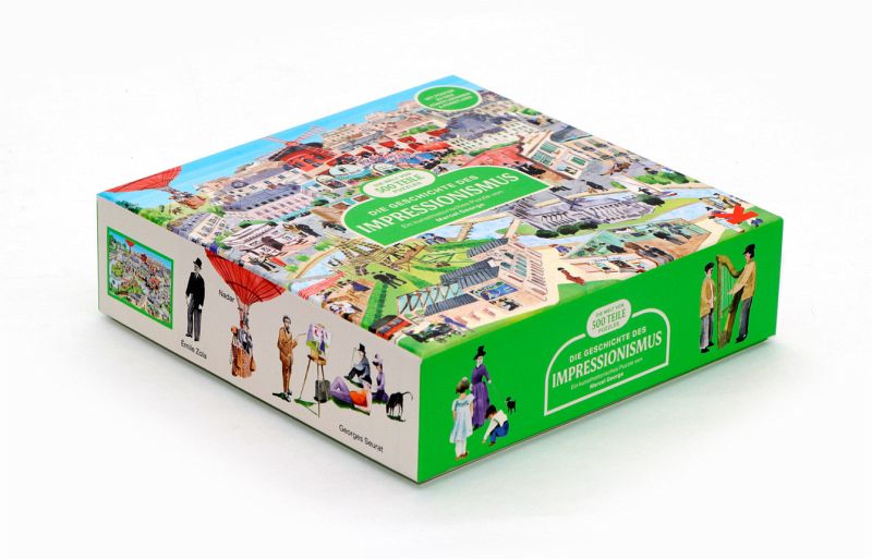 > Neues, kompaktes Puzzle-Format mit 500 Teilen > Gestaltet von unserem erfolgreichen Illustrator Marcel George > Mit Künstler_innen wie Edouard Manet, Georges Seurat und Berthe Morisot Erfahren Sie mehr über die Ideen und die Geschichte des Impressionismus, während Sie 500 Teile zusammensetzen und dabei einflussreiche Persönlichkeiten und Ereignisse dieser besonderen Kunstepoche entdecken. Erkunden Sie das Paris der impressionistischen und postimpressionistischen Maler_innen sowie die Menschen und Orte, die dazu beigetragen haben, die moderne Kunstbewegung zu erschaffen. Stoßen Sie mit Édouard Manet in den Folies Bergères an, sitzen Sie in der ersten Reihe des Moulin Rouge von Henri de Toulouse-Lautrec, begegnen Sie Georges Seurat am Ufer der Seine und beobachten Sie Edgar Degas, wie er die Ballerinen der Pariser Oper skizziert.