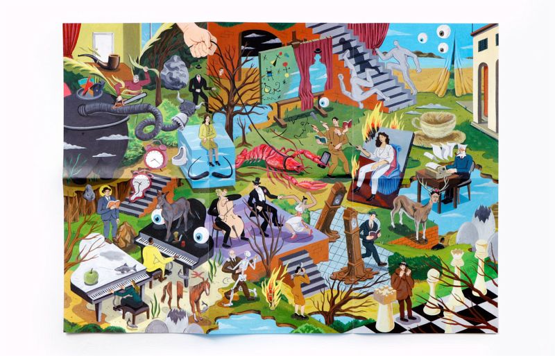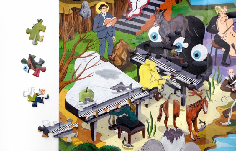 > Neues, kompaktes Puzzle-Format mit 500 Teilen > Erstmals illustriert von der Comic-Ikone Brecht Vandenbroucke > Mit Künstler_innen wie Salvador Dali, René Magritte und Giorgio de Chirico Erfahren Sie mehr über die Ideale und Bilder des Surrealismus, während Sie dieses 500-Teile-Puzzle zusammensetzen und entdecken Sie dabei einflussreiche Persönlichkeiten und Ereignisse dieser Kunstströmung. Begegnen Sie den Künstler_innen, Dichter_innen und Musen, die die Kunstwelt auf den Kopf stellten und dann durch den Spiegel schoben. Schlendern Sie durch die verlassenen Straßen einer Giorgio de Chirico-Stadt und folgen Sie Salvador Dalís Schnurrbart und René Magrittes Melone in eine Welt, in der eine Pfeife keine Pfeife ist, Sigmund Freud einen Tango mit einem Skelett tanzt, Hummer ans Telefon gehen und Esel auf Klavieren stehen!