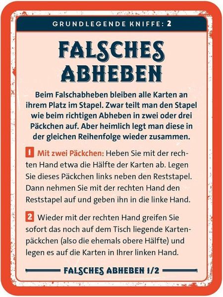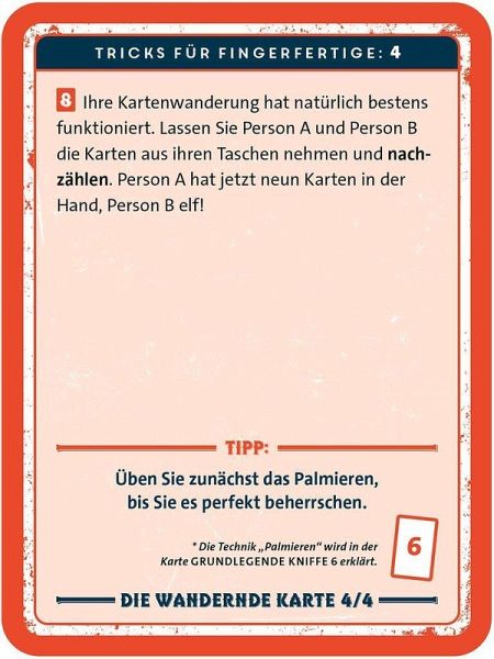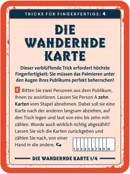 Die Welt der Kartentricks - Leichtgemacht!Mit diesen 33 Kartentricks kann man seine Gäste, Familie und Freunde zum Staunen bringen. Die leichtverständlichen Anleitungskarten zeigen die verschiedensten Tricks und Kniffe, die es benötigt faszinierende Kunststücke zu vollführen und der Magie der Karten ein wenig näherzukommen. Zum Eintauchen und Entdecken der magischen Welt der Kartenkunst.Hochwertige MatchboxInhalt: 50 Rätselkarten inklusive Skat-Kartenblatt (32 Karten)