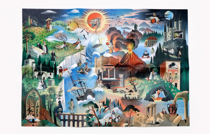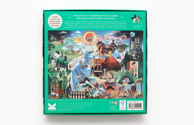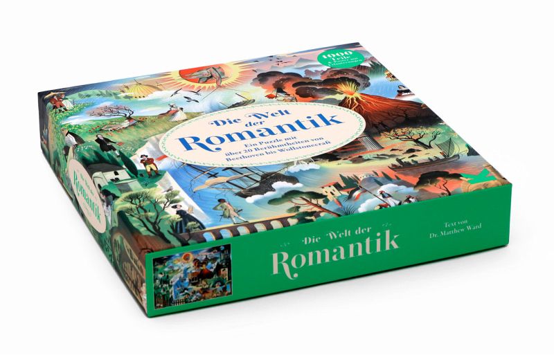 Und tatsächlich ist hier das Who is Who der Romantik versammelt. William Turner, John Keats, Beethoven, Lord Byron oder Mary Shelley tauchen in dieser wimmeligen Illustration auf, wie die prägenden Werke aus der Epoche. Da macht das Puzzlen natürlich gleich noch mehr Freude.