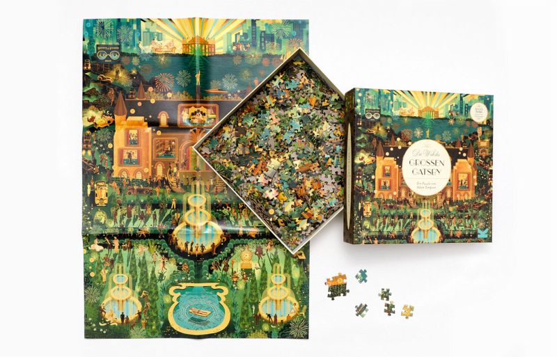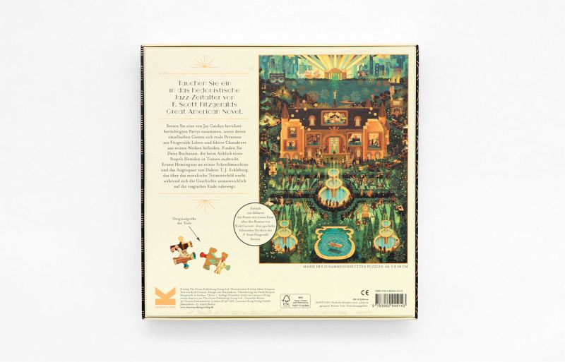 Setzen Sie die Welt dieses Klassikers der Literatur zusammen und entdecken Sie dabei eine Vielzahlberühmter realer und fiktiver Figuren. Finden Sie Gatsby, Daisy, Nick Carraway und Tom Buchanan neben F. Scott Fitzgerald, Zelda Fitzgerald und ihren Zeitgenoss_innen in diesem 1000-Teile-Puzzle, das Sie in die Welt vom großen Gatsby und seinem Autor eintauchen lässt.- Betreten Sie die glamouröse und tragische Welt des großen Gatsby- A2-Poster dient als Vorlage und enthält zahlreiche Infos zu den Figuren und realen Personen- 1000 Teile