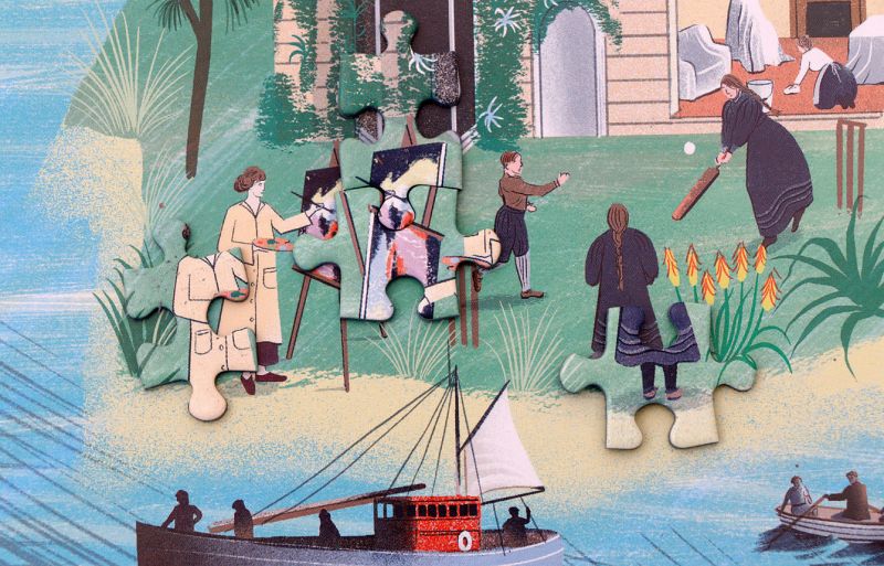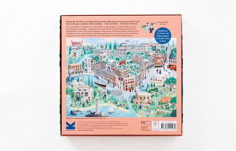 Von den Stränden von Cornwall bis zu den Straßen von Bloomsbury und vom Hogarth House bis zu den Colleges von Cambridge - entdecken Sie Leonard Woolf, Clive und Vanessa Bell und Vita Sackville-West sowie Clarissa Dalloway, Orlando und die Familie Ramsay. Erkunden Sie außerdem die Orte, die Woolfs Charaktere prägten und ihre bahnbrechenden Bücher inspirierten, die dazu beitrugen, unser Verständnis der Moderne zu formen.1000-TEILE-PUZZLE, das ein perfektes Geschenk für Fans von Virginia Woolf und ihrer Arbeit ist.ENTHÄLT EIN POSTER, damit Sie alle Charaktere erkennen und ihre Geschichten nachlesen können."DIE WELT VON..." PUZZLES sind eine unterhaltsame Art, das Leben und Werk von Autor_innen und Künstler_innen zu feiern.