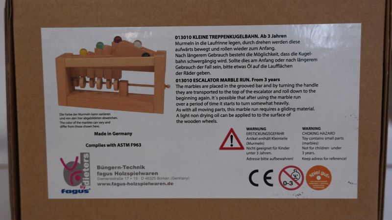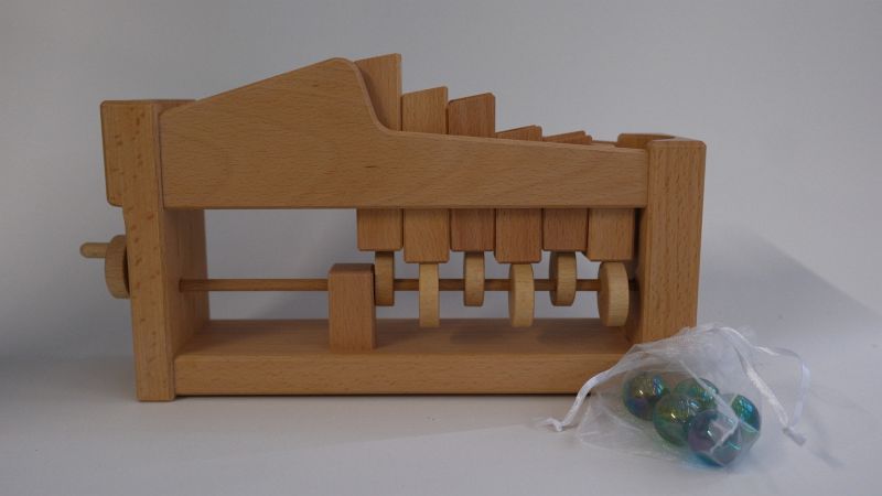 Eine Kurbel dreht die Achse mit exzentrisch angeordneten Rädern, die die Stößel auf und ab schieben, damit die Kugel treppenförmig nach oben bewegt werden. Aus heimischer Buche in Deutschland gefertigt. 29 x 7,5 x 17, 5 cm, mit 5 Murmeln aus Glas, ab 3 Jahren.
