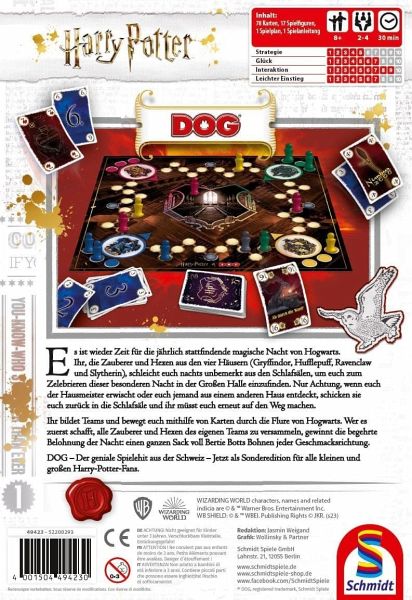 Es werden Teams gebildet und mithilfe von Karten durch die Flure von Hogwarts bewegt. Wer es zuerst schafft, alle Zauberer und Hexen des eigenen Teams zu versammeln, gewinnt die begehrte Belohnung der Nacht: einen ganzen Sack voll Bertie Botts Bohnen jeder Geschmacksrichtung. DOG – Der geniale Spielehit aus der Schweiz – Jetzt als Sonderedition für alle kleinen und großen Harry-Potter-Fans.