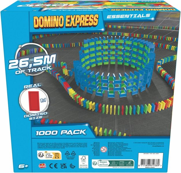 Im November 2020 kommt der beliebte Live-TV Klassiker Domino Day zurück ins Deutsche Fernsehen! Mit dem Domino Express kann der Domino Day ganz einfach nach Hause verlegt werden. Die bunten Domino-Steine ganz vorsichtig im gleichen Abstand hintereinander aufstellen. Verschiedene Hindernisse können in den Parcours eingebaut werden und erhöhen die Schwierigkeit. Werden alle Domino-Steine umfallen? Domino Express bietet coolen Action-Spaß, bei dem man immer wieder coole neue Parcours aufbauen kann. Mit dem Domino Express 1000 Pack erhält man weitere 1000 bunte Domino-Steine, mit denen man noch größere Parcours von bis zu 26,5 Meter Länge bauen kann und die für noch mehr Domino-Spaß sorgen. Auf der Verpackung ist ein Aufbaubeispiel abgebildet, um die Kreativität anzuregen.