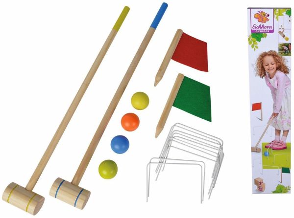 Beim Eichhorn Krocket Spiel müssen bunte Holzkugeln mit hammerähnlichen Schlägern aus Holz durch kleine Tore in einer vorgegebenen Reihenfolge und Richtung bis zum Ziel gebracht werden. Das Set beinhaltet zwei 65 cm große Schläger, 4 Bälle mit einem Durchmesser von 50 mm, ein Start- und ein Ziel-Stab sowie 10 Tore zum Aufstellen. Zu Ostern, zum Geburtstag oder einfach so ist das Krocket Set die perfekte Geschenkidee und sorgt für großen Spielspaß in jedem Garten und Park. Das Spiel ist super leicht und schnell auf der Wiese aufgebaut und spielbereit, und ist für Kinder ab drei Jahren geeignet.