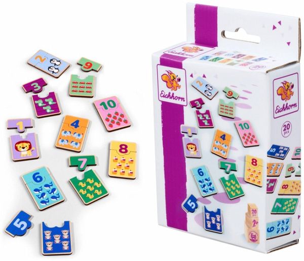 Mit dem 20-teiligen Eichhorn Holzspiel "Zahlen lernen" wird das Zählen zum Kinderspiel! Dieses hochwertige Set, geeignet für Kinder ab 2 Jahren, führt die Kleinsten spielerisch in die Welt der Zahlen von 1 bis 10 ein. Jedes Puzzleteil zeigt eine Zahl, die mit einem niedlichen Kindermotiv kombiniert wird. Dein Kind lernt, die passenden Holzplatten zusammenzusetzen und entwickelt dabei ganz nebenbei ein erstes Verständnis für Zahlen und Mengen. Durch das Zusammensetzen der Zahlen mit den entsprechenden Motiven wird das Zahlenverständnis gefördert, und die motorischen Fähigkeiten werden geschult. Das kindgerechte Design und die stabilen Holzteile machen das Spiel zu einem langlebigen Begleiter in der frühen Entwicklungsphase. Eichhorn "Zahlen lernen" - das perfekte Spielzeug, um spielerisch erste Mathematikkenntnisse zu erlernen!