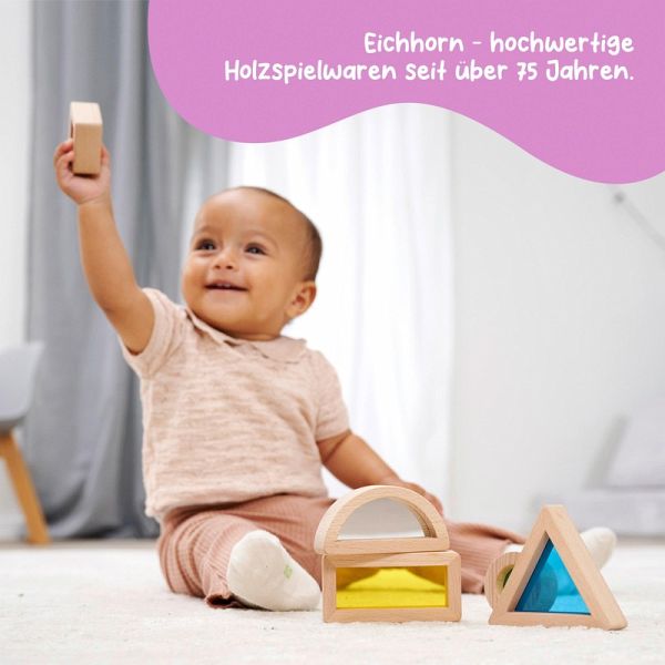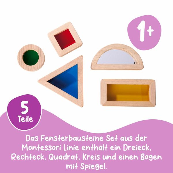 Die Montessori Fensterbausteine in 5 verschiedenen Formen sind eine spannende Sache. Sie sind mit farbigem Acrylglas gefüllt und laden zum Entdecken ein. So können die Kinder die Welt durch eine bunte Linse beobachten. Besonders der Baustein mit der Spiegelfolie wird die Kleinen staunen lassen. Das 5 teilige Set enthält ein Dreieck, Rechteck, Quadrat, Kreis und einen Bogen mit Spiegel. Die Fensterbausteine von Eichhorn bestehen auf 100% FSC zertifziertem Buchenholz und sind für Kinder ab 1 Jahr geeignet. Lernziele: Farben und geometrische Formen lernen Sinnesanregung Auge-Hand- Koordination