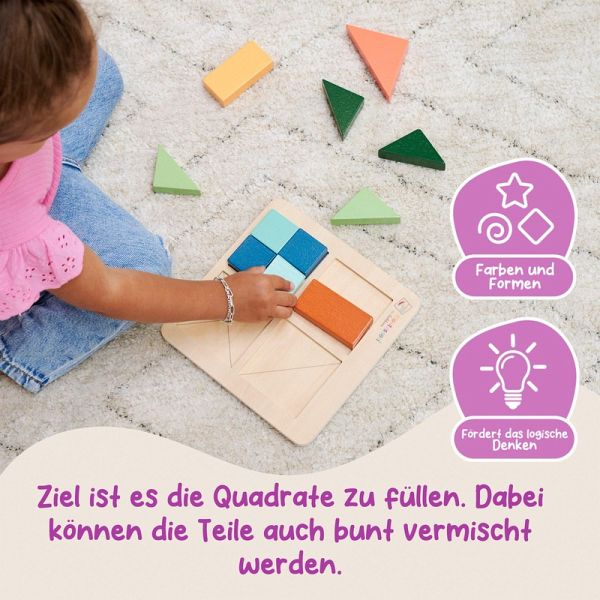 Das Montessori Formenpuzzle ist nicht nur optisch ein Hingucker. Es besteht aus 12 Puzzleteilen in verschiedenen Formen. Ziel ist es die Quadrate zu füllen. Dabei können die Teile auch bunt vermischt werden. Das Montessori Formenpuzzle besteht aus 100% FSC zertifiziertem Birken- und Lindenholz und ist für Kinder ab 2 Jahren geeignet. Lernziele: Formwahrnehmung Mengenwahrnehmung Geduld Feinmotorik Logisches Denken