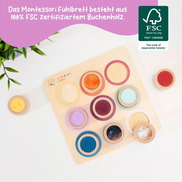 Fühlen ist eine wichtige sensorische Entwicklung für dein Kind. Das Spiel mit verschiedenen Oberflächen und Materialien fördert den Tastsinn. Bei unserem Montessori Fühlbrett gibt es 9 Fühlzylinder, bei denen dein Kind die Oberflächen und Texturen ertasten kann. Das Montessori Fühlbrett besteht aus 100% FSC zertifiziertem Buchenholz und ist für Kinder ab 3 Jahren geeignet. Lernziele: Taktile Wahrnehmung Augen-Hand-Koordination Konzentration Geduld Farbwahrnehmung