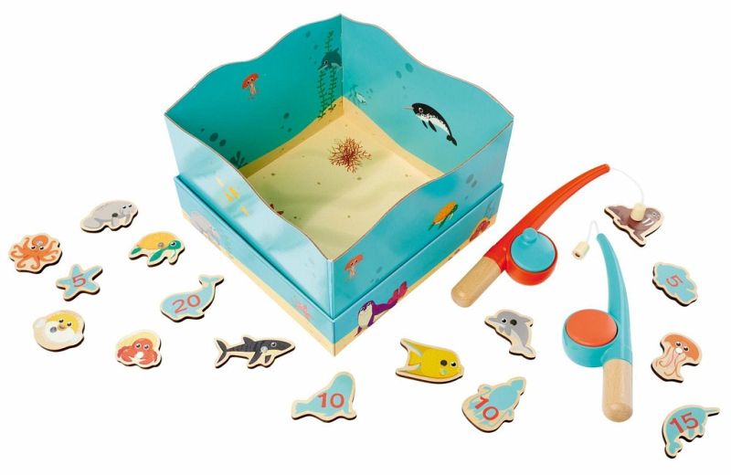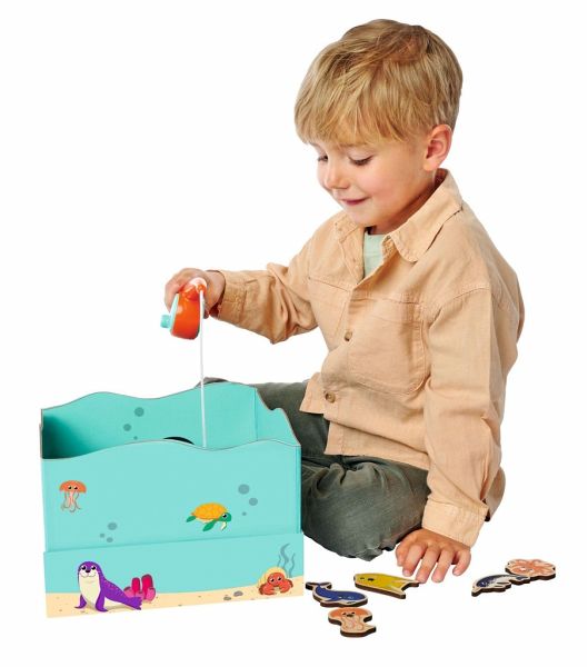 An den beiden Angeln sind Magnete befestigt mit dem man die Fische und andere Meeresbewohner herausholen kann.Auf der Rückseite der Fische sind Zahlen aufgedruckt, jeder Spieler zählt seine Punkte zusammen, somit kann der Sieger des lustigen Spiels herausgefunden werden.
