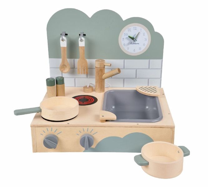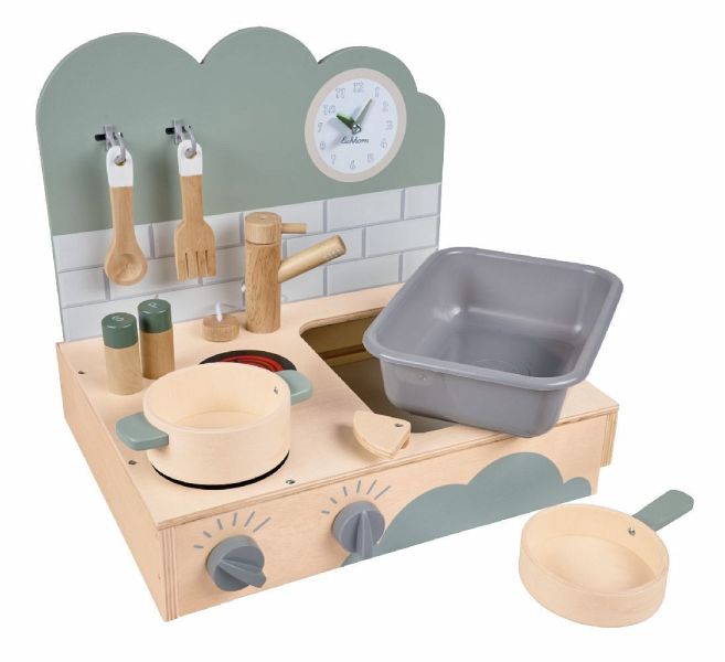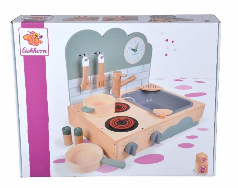 Eichhorn Kleine Tischküche: Die kleine Tischküche bietet mit einem Kochfeld mit Sound und entsprechenden Dreh-Knöpfen mit Klack Funktion, einer Pfanne und einem Topf, einem Spülbecken mit Wasserhahn, Kochlöffel und Pfannenwender, Salz- und Pfefferstreuer, und einer verstellbaren Uhr, alles was kleine Köche oder Köchinnen benötigen. Aufgebaut hat die Spielküche eine Größe von 40 x 35 x 31 cm. Für Kinder ab 3 Jahren geeignet.