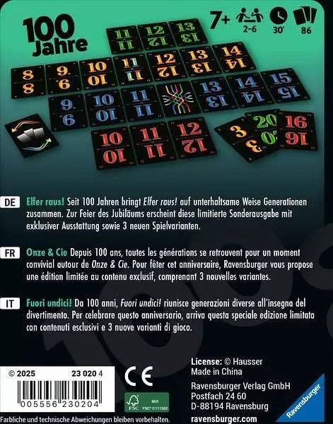 Seit 100 Jahren bringt Elfer raus! auf unterhaltsame Weise Generationen zusammen. Zur Feier des Jubiläums erscheint diese limitierte Sonderausgabe mit exklusiver Ausstattung sowie 3 neuen Spielvarianten.