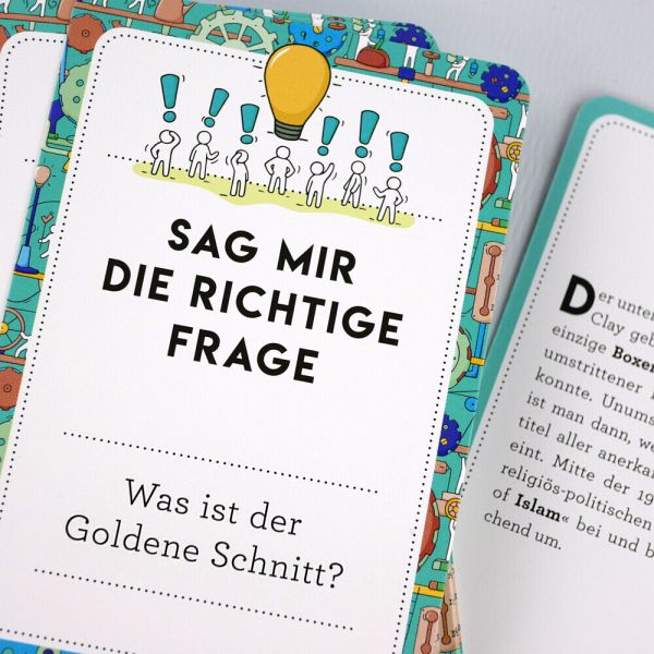 Kinder stellen tausend Fragen. Wir Erwachsenen hingegen trauen uns oft nicht mehr, genau nachzufragen - schließlich müssten wir es ja längst verstanden haben. Im Bestseller "Erklärs mir, als wäre ich 5" werden grundlegende und außergewöhnliche Fragen auf möglichst einfache Art und Weise beantwortet. Das Kartenspiel bringt eure Köpfe zum Rauchen, indem es Antworten liefert, für die ihr die passenden Fragen erst noch finden müsst - und Antworten, von denen durchaus nicht alle so ganz richtig sind, die sich dafür aber umso plausibler anhören. Für alle Querdenker, Nachbohrer und Besserwisser, die sich gern auch mal an der Nase herumführen lassen ...