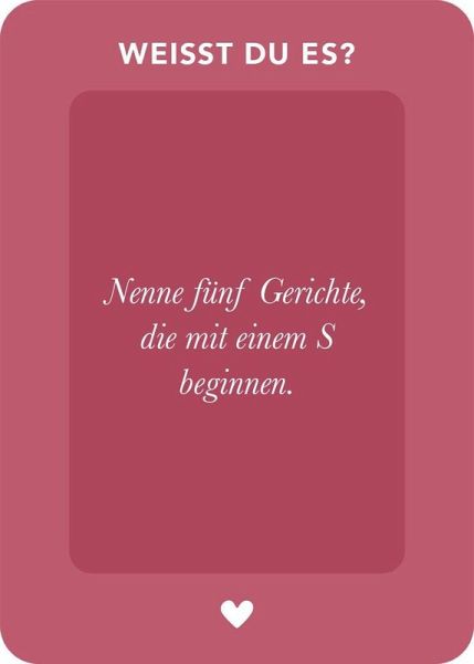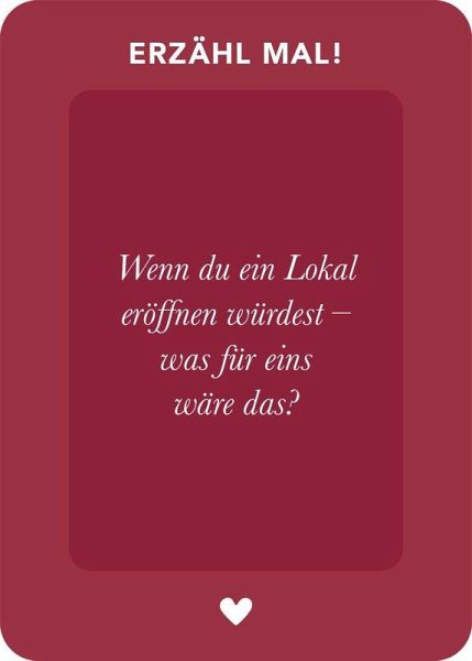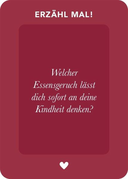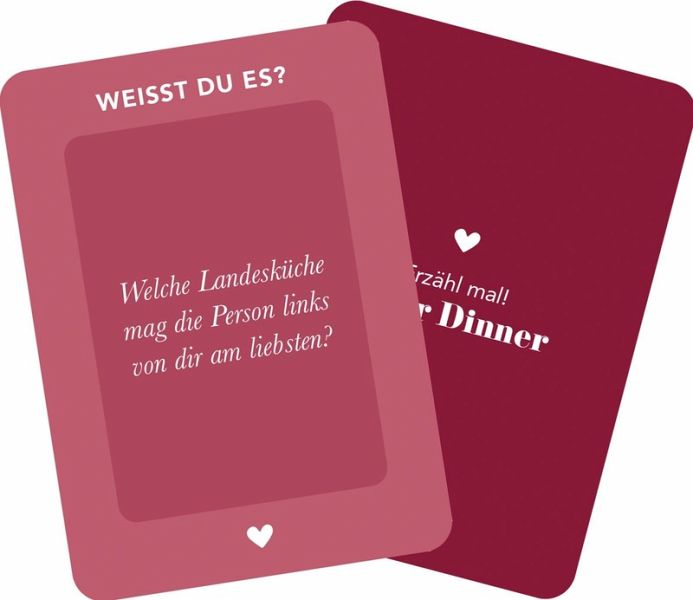 Erzähl- und Quizspiel für 3-8 Spieler110 Spielkarten in den Kategorien »Weißt du es?«, »Erzähl mal!« und »Aktion« mit SpielanleitungOriginelles Mitbringsel oder Geschenk zur EssenseinladungEin schönes Geschenk für Familie und Freunde, das unterhaltsame Gespräche anregt