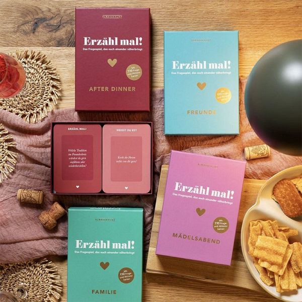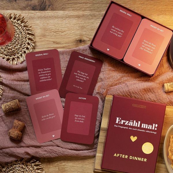 »Erzähl mal! After Dinner« ist ein originelles Geschenk für alle, die gerne kochen oder nach dem Essen noch gemütlich zusammensitzen. Das Konversationsspiel fragt nach Lieblingsrezepten, kulinarischen Erinnerungen oder Wissenswertem aus der Küche und führt so zu spannenden und unterhaltsamen Gesprächen mit Familie oder Freunden.
