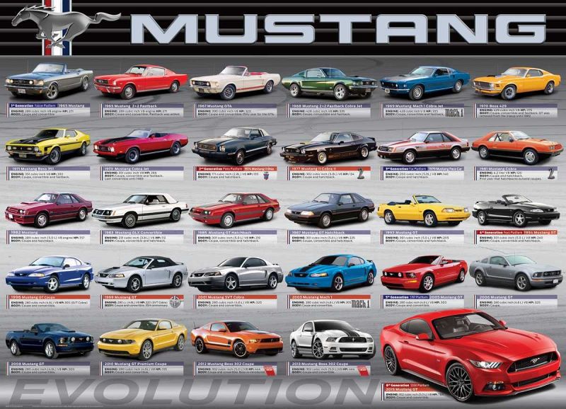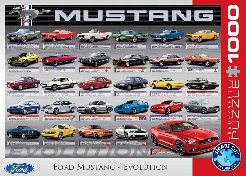 Strong high-quality puzzle pieces. Made from recycled board and printed with vegetable based ink. Box size: 10 x 14 x 2.37. Finished Puzzle Size: 19.25 x 26.5. 1000-Piece Puzzle. Celebrate the 50th anniversary of the production of the Ford Mustang with this comprehensive chart of this historic vehicle.