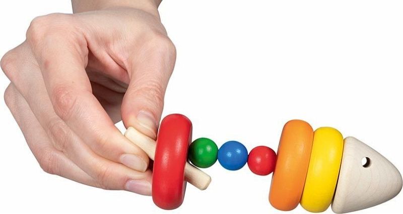 Felix besteht aus Ahorn und ist ein Fisch, ein Fädelfisch. Mit seinen bunten Streifen könnte er auch ein Regenbogenfisch sein. Doch da die Kleinen die Holzringe mit einer Schnur verbinden, dachten wir, es kann nur ein Fädelfisch sein. Dafür schwimmt er nicht weg.