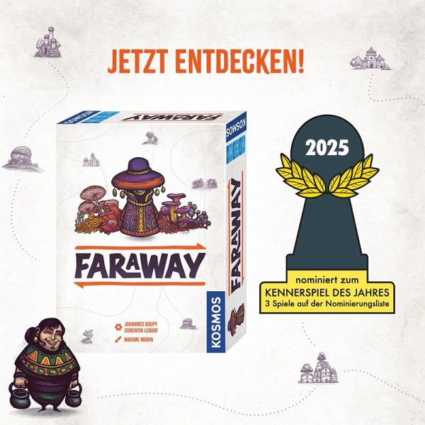 Entdeckt die Geheimnisse jenseits des Nebelmeers! In Faraway erkunden bis zu sechs Spielerinnen und Spieler ab zehn Jahren den sich ständig verändernden Kontinent Alua. Das Besondere: Die Karten werden in acht Runden von links nach rechts ausgelegt, während die Bewohner spannende Aufgaben stellen, die am Ende Ruhmespunkte einbringen. Das Besondere: Die Wertung erfolgt in umgekehrter Reihenfolge – von rechts nach links! Nur eine geschickte Strategie auf der Reise durch Alua wird zum Sieg verhelfen. Origineller und schneller Spielspaß zu zweit oder in der Gruppe.