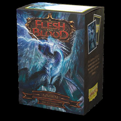 Clear front and Azvolai artwork by Federico Musetti on a Matte back.Go again and again with confidence knowing your FaB cards are protected by Dragon Shields!  Dragon Shield Matte Art Sleeves have artwork which is printed directly onto the sleeve and do not peel or split. Matte Art sleeves combine the textured Matte back with stunning artwork while maintaining excellent handling capabilities.Each pack comes with 100 sleeves, more than enough for your Classic Constructed deck.The sturdy cardboard box fits 75+ single sleeved cards or 65+ double sleeved cards, perfect for a blitz deck.Every box has a label at the top of the box for personalization.Flesh and Blood logos and images ŠLegend Story Studios. Licensed for use by Arcane Tinmen.