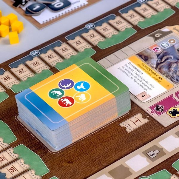 So vergeht Runde um Runde, bei im Schnitt 2-3 Stunden Spielzeit, in der jeder immer fleissig und möglichst geschickt seine Pläne umzusetzen sucht. Interaktion gibt es dabei kaum, da jeder auf seiner Zootafel plant und wirtschaftet, mal vom Wegschnappen ausliegender Karten oder den besonderen Fähigkeiten mancher Tiere (z.B. sorgt das Gift mancher Schlange für das temporäre Zwangsausspielen von Aktionskarten) abgesehen. Aber das ist ok, es ist technisch gesehen ein Multiplayer-Solitärspiel, aber man schaut immer gerne bei den anderen zu, allein schon um die vielen schicken Karten kennen zu lernen – und bis man die alle im Spiel aktiv gesehen hat, vergehen einige Partien! Die eigene Planung sollte aber taktisch nicht versumpfen, da man sonst zur Grübelbremse werden kann, somit bitte gerne die Ideen während der Mitspielerzüge eruieren :)!