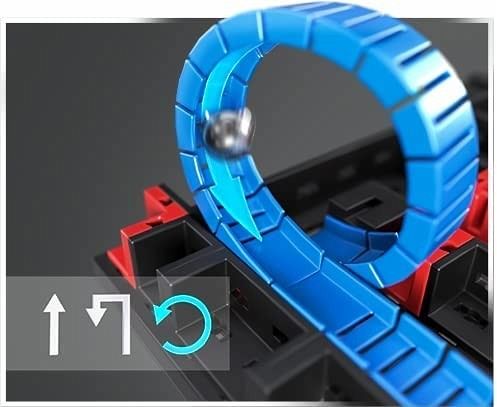 Im Baukasten inklusive: Flexprofile, 90 Grad Kurve, Stahlkugel, Spielbeschreibung