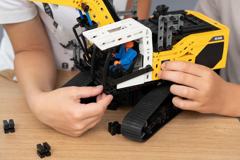 Erlebe die Faszination eines detailgetreuen Hydraulikbaggers – mit dem Pneumatischen Bagger Liebherr R 938 von fischertechnik.