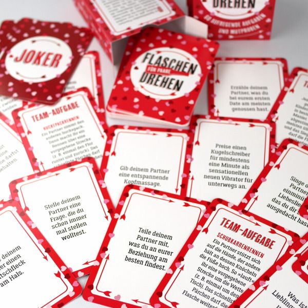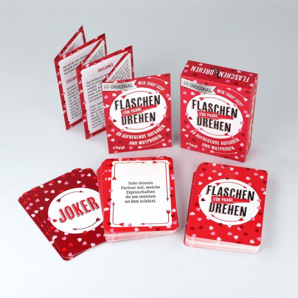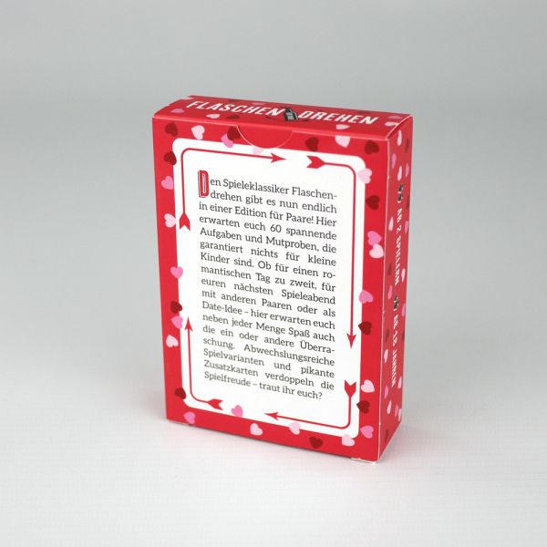 Den Spieleklassiker Flaschendrehen gibt es nun endlich in einer Edition für Paare! Hier erwarten euch 60 spannende Aufgaben und Mutproben, die garantiert nichts für kleine Kinder sind. Ob für einen romantischen Tag zu zweit, für euren nächsten Spieleabend mit anderen Paaren oder als Date-Idee - hier erwarten euch neben jeder Menge Spaß auch die ein oder andere Überraschung. Abwechslungsreiche Spielvarianten und pikante Zusatzkarten verdoppeln die Spielfreude - traut ihr euch?