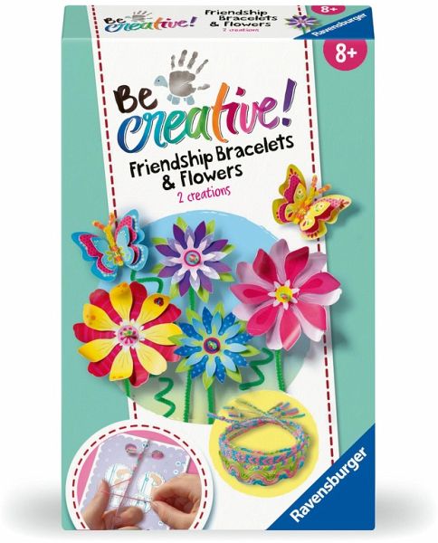 Mit dem BeCreative Set Freundschaftsbändchen & Blumen von Ravensburger basteln Kinder ab 8 Jahren bunte Blüten und Schmetterlinge aus vorgestanztem Papier und knüpfen Armbänder für sich selbst oder Freunde. Mit Hilfe der Unterlage zum Knüpfen und 3 verschiedenfarbigen Garnen, entstehen ganz einfach Freundschaftsbändchen. Die beigelegte Anleitung ermöglicht den Jungen und Mädchen verschiedene Arten des Bastelns und Knüpfens zu erlernen und auszuprobieren. Die BeCreative-Sets von Ravensburger inspirieren Kinder zum Selbermachen! Aus den im Set enthaltenen gestanzten Papieren, den bunten Perlen, Pfeifenputzern und Knüpfgarnen entstehen 4 Blüten, 2 Schmetterlinge und 4 Armbänder. Um gleichmäßige Ergebnisse zu erzielen, liegt eine Unterlage zum Knüpfen bei und eine Sicherheitsnadel kann für Korrekturen oder kompliziertere Knüpfmuster eingesetzt werden. Eine Anleitung gibt verschiedene Arten des Knüpfens verschiedener Freundschaftsbändchen vor. Die Freundschaftsbändchen können an Freunde verschenkt werden oder den eigenen Arm schmücken.