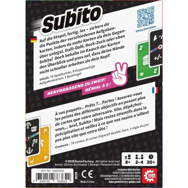 die Spieler, gegeneinander oder in Teams, ruckzuck ihre Karten an ausliegende Aufgabenkarten…mehrReview-Fazit zu „Subito“, einem extra schnellen Kartenspiel.