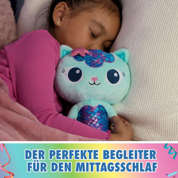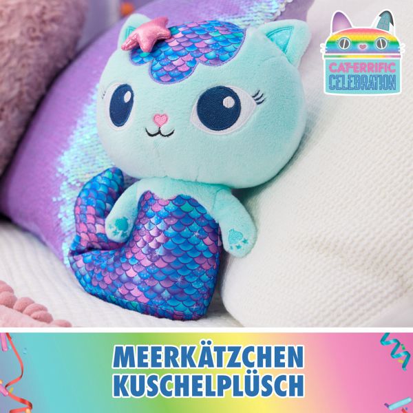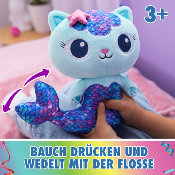 GDH Soft Feature Plüsch - MerCat Die DreamWorks Gabby's Dollhouse Spielzeuge von Spin Master lassen Vorschulkinder in eine fantasievolle Welt voller Möglichkeiten eintauchen. Das interaktive und super weiche Meerkätzchen eignet sich sowohl zum Spielen als auch zum Kuscheln. Mit diesem knuddeligen 25 cm großen Plüschkätzchen erwacht Gabbys Freundin aus der Serie zum Leben. Mit ihren wunderschön schimmernden Schuppen, ihrer entzückenden Meerjungfrauenflosse, den gestickten Details und einem leuchtenden Seestern auf ihrem Kopf ist das Meerkätzchen der ideale Begleiter für Abenteuer in der Freizeit oder Kuschelpartnerin beim Schlafengehen. Das interaktive Plüschtier kann außerdem seine Flosse bewegen . Einfach den Bauch von Meerkätzchen drücken und schon bewegt sich die Meerjungfrauenflosse im Tempo des Drückens. Gabby's Dollhouse-Spielzeug ist das ideale Geschenk für Kinder, die Fans der beliebten Netflix-Serie sind und gerne Puppenhauswelten nachbauen. Mit einer Auswahl aus liebenswerten Katzenfiguren, Zubehörteilen und Puppenhausmöbeln können Kinder ab 3 Jahren ihre ganz eigene Gabby's Dollouse Welt zuhause lebendig werden lassen. Von Spin Master gibt es viele weitere Gabby's Dollhouse Spielzeuge, wie das Partyzimmer Spielset, das das Puppenhaus mit einem Skate-Park um ein Dachgeschoss erweitert oder weitere niedliche Deluxe Räume (alles separat erhältlich), die in das Puppenhaus eingeschoben werden können und die Spielwelt erweitern. Inhalt: _ 1 Meerkätzchen als Plüschspielzeug Maße: 19,05 x 11,43 x 26,67 cm