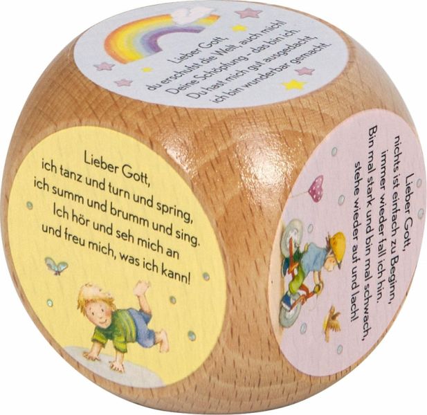 Dieser Gebetswürfel ist mehr als ein Spiel - er ist eine liebevolle Einladung an Kinder ab 2 Jahren, Vertrauen in sich und die Welt zu entwickeln. Positive Affirmationen vermitteln Selbstliebe und Geborgenheit und machen deutlich: Gott liebt dich, so wie du bist! Hochwertig aus Buchenholz gefertigt, vierfarbig bedruckt und mit dezenter Folienveredelung versehen, ist dieser Würfel ein wertvoller Begleiter - nicht nur für die Kleinen, sondern für die ganze Familie.