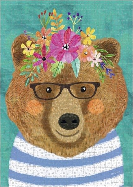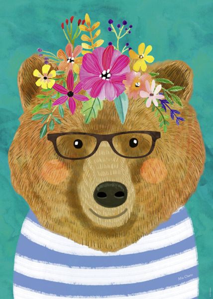 Brille auf der Nase, Blümchen auf dem Kopf - Mia Charros gut gelaunter Bär brummt nur aus reiner Zufriedenheit. Wird man beim Puzzeln bestimmt auch so machen.Sprachen: Deutsch, Englisch, Französisch, Italienisch, Spanisch