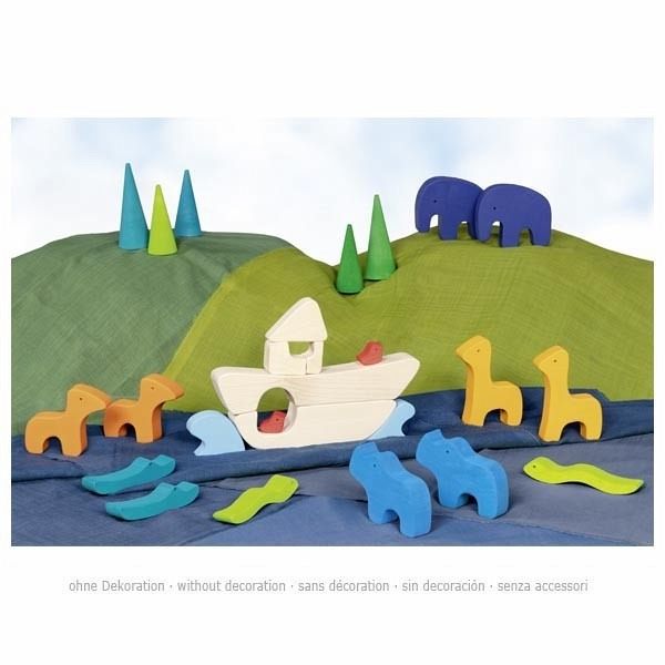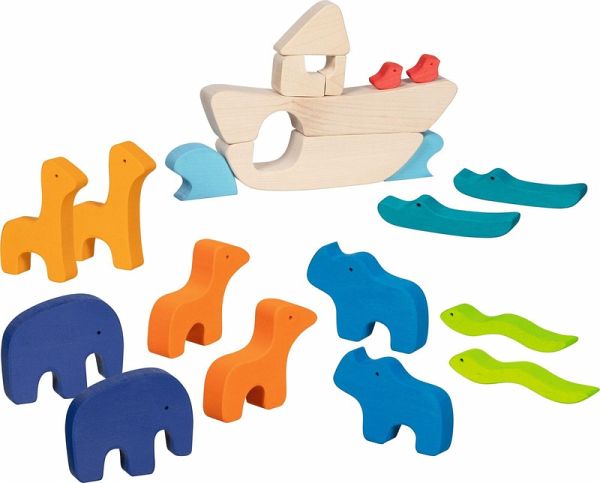 Mit der Arche Noah lässt sich sowohl Geschichte nachspielen als auch kreativ frei bauen. Zu immer neuen Geschichten und Bauwerken laden die bunten Holzfiguren ein, die durch ihre besondere Haptik und die besonderen Formen die Lust an der spielerischen Freiheit unterstützen und darüberhinaus fördern.